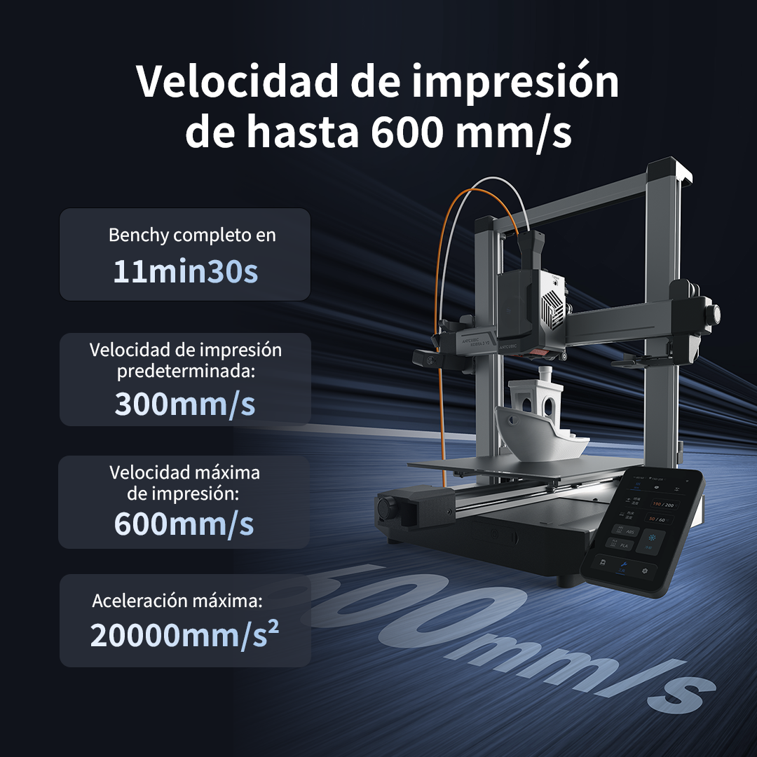 La velocidad de impresión recomendada es de 300 mm/s, con una velocidad máxima de hasta 600 mm/s y una aceleración máxima de 20,000 mm/s². El tiempo para imprimir un pequeño barco (altura de capa 0.2 mm) es de aproximadamente 13 minutos.