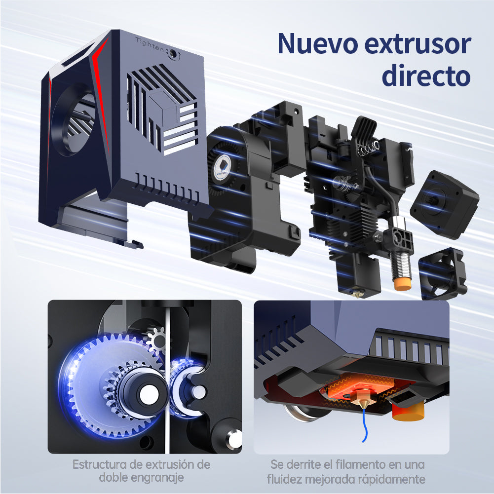 La potencia del extrusor mejorado alcanza hasta 60 vatios, derrite rápidamente el filamento con una mayor fluidez; la estructura de extrusión de doble engranaje controla con precisión la entrega de material.