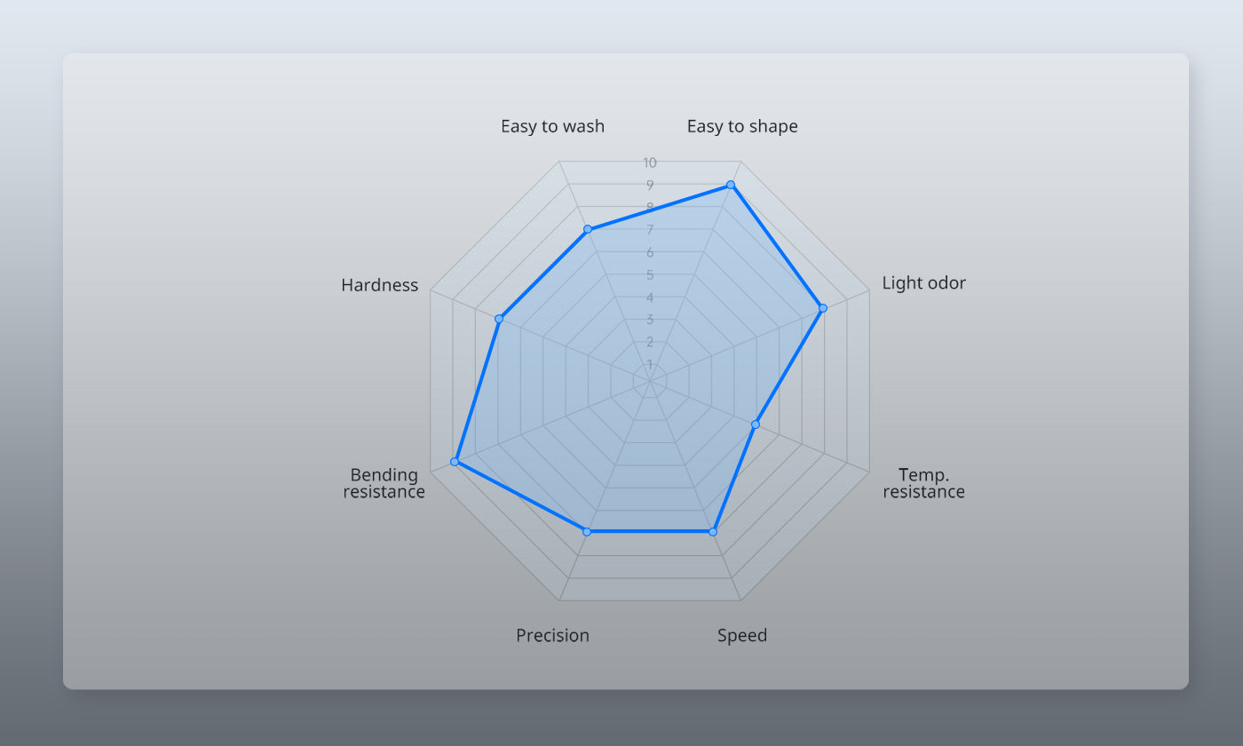 Su baja viscosidad y alta fluidez acortan los tiempos de curado y facilitan la formación del modelo. La resina promueve un reflujo rápido, minimizando la delaminación durante la impresión. Además, ofrece una mejor adhesión a la placa base, lo que reduce eficazmente el riesgo de fallos de impresión.