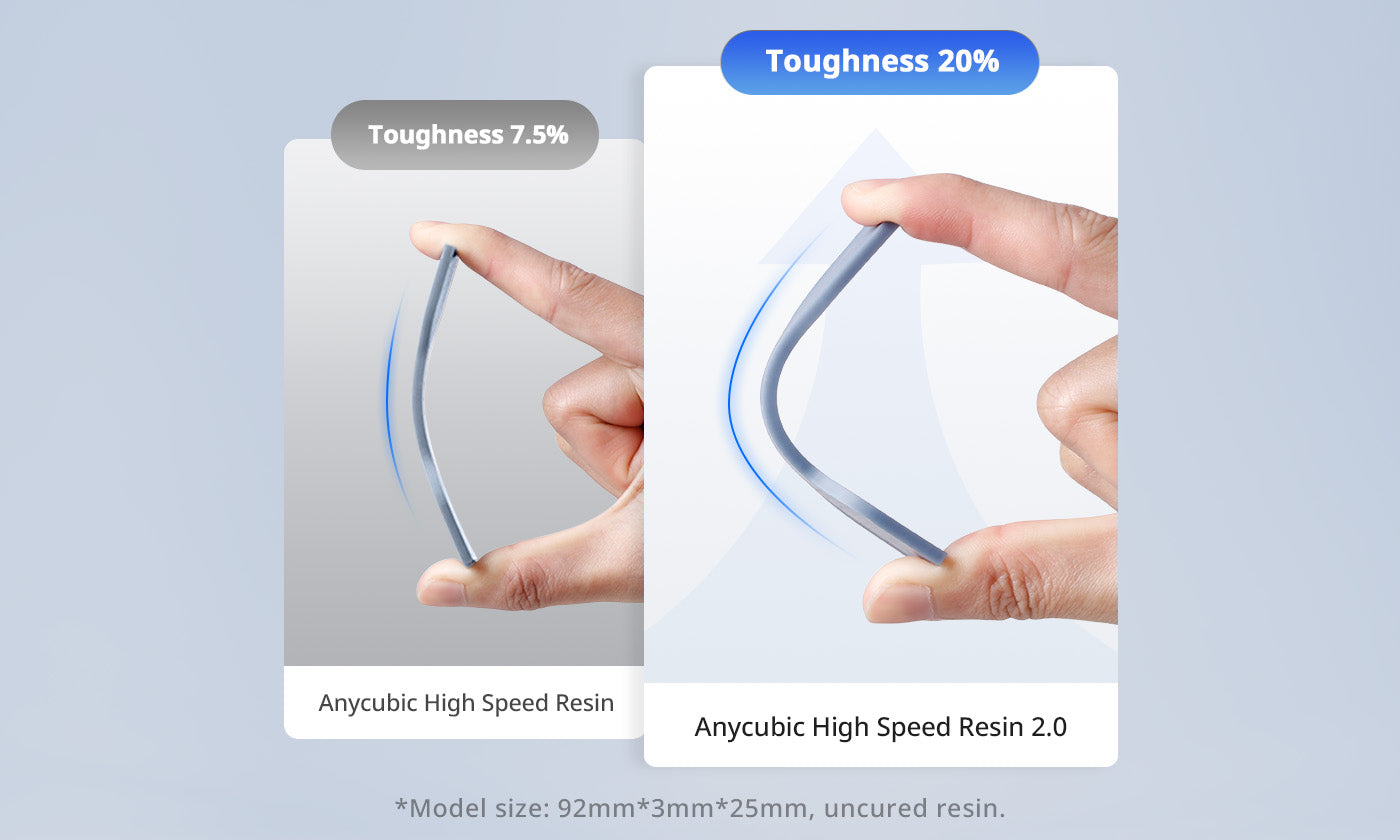 Gracias a la fórmula mejorada, la resiliencia de Anycubic High Speed Resin 2.0 mejora del 7,5% al 20%, en comparación con Anycubic High Speed Resin.