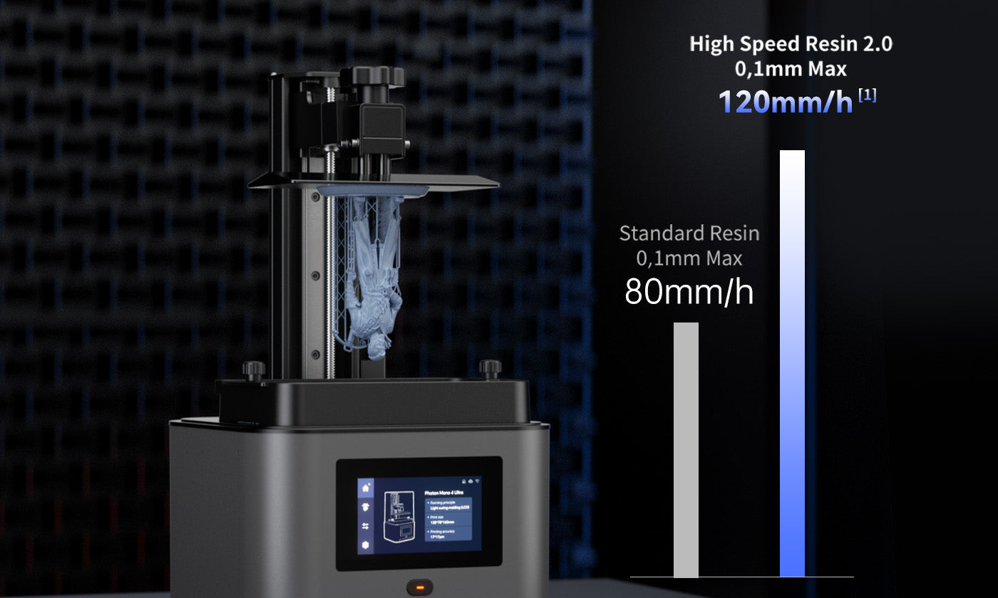 Altura de capa de 0,1 mm Prueba EstándarResina estándar: Máx. 80 mm/hResina de Alta Velocidad 2.0: Máx. 120 mm/h*