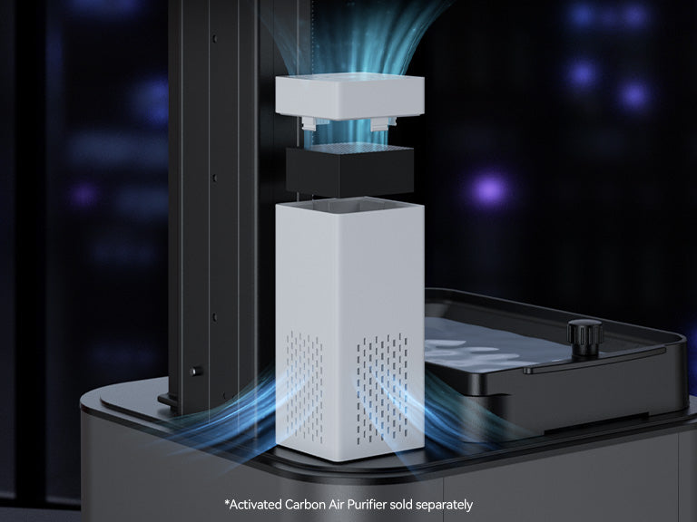 El filtro de carbón activado de alta densidad de 18 mm, con un peso de 17 gramos, está diseñado para capturar y neutralizar de manera eficiente las moléculas de olor producidas durante la impresión.