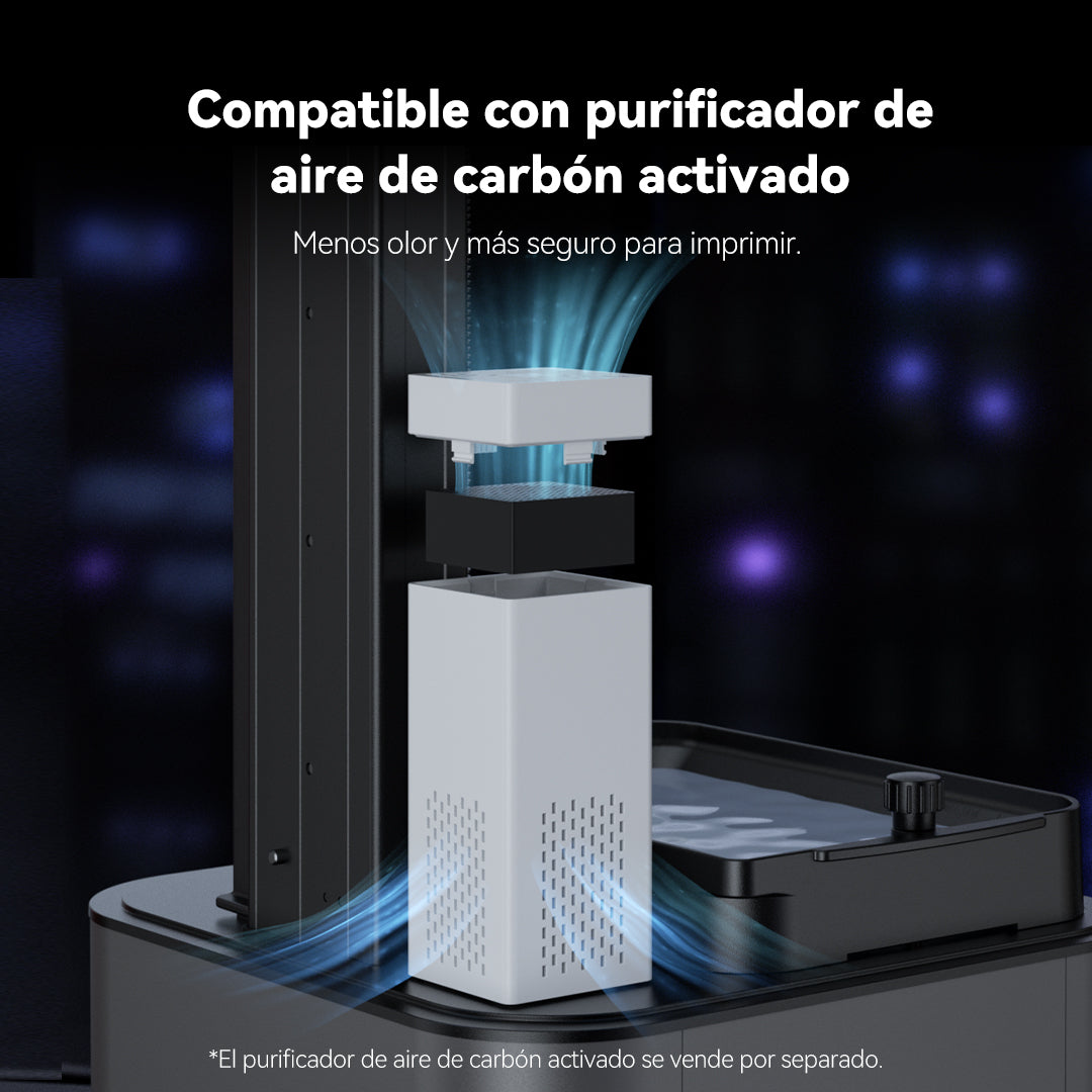 El filtro de carbón activado de alta densidad de 18 mm, con un peso de 17 gramos, está diseñado para capturar y neutralizar de manera eficiente las moléculas de olor producidas durante la impresión.