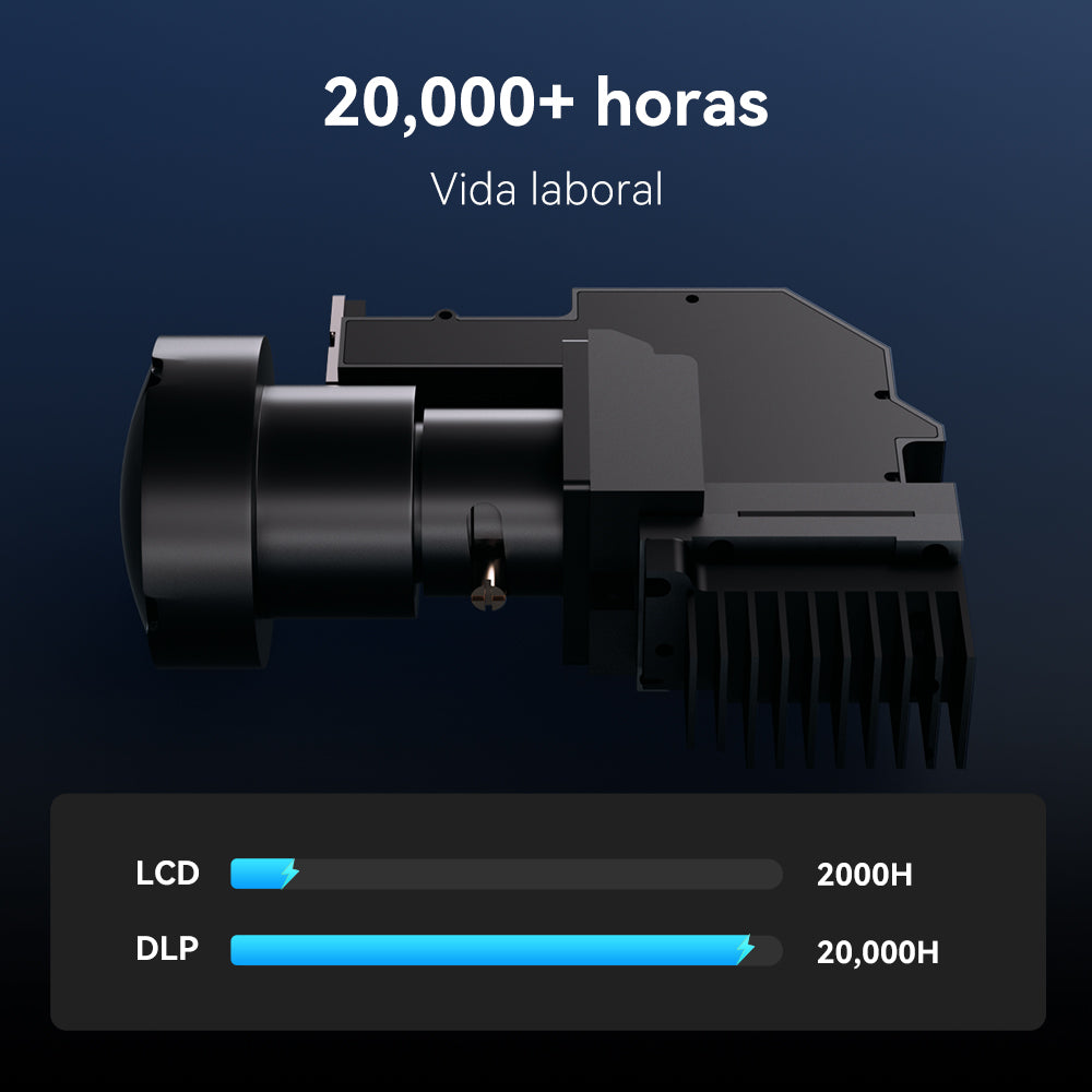 Gracias a la tecnología DLP®, el sistema de fuente de luz de Anycubic Photon Ultra no necesita ser reemplazado tan a menudo como una impresora LCD 3D y tiene una vida útil de más de 20 000 horas, 10 veces más que las 2000 horas de las pantallas LCD monocromáticas.