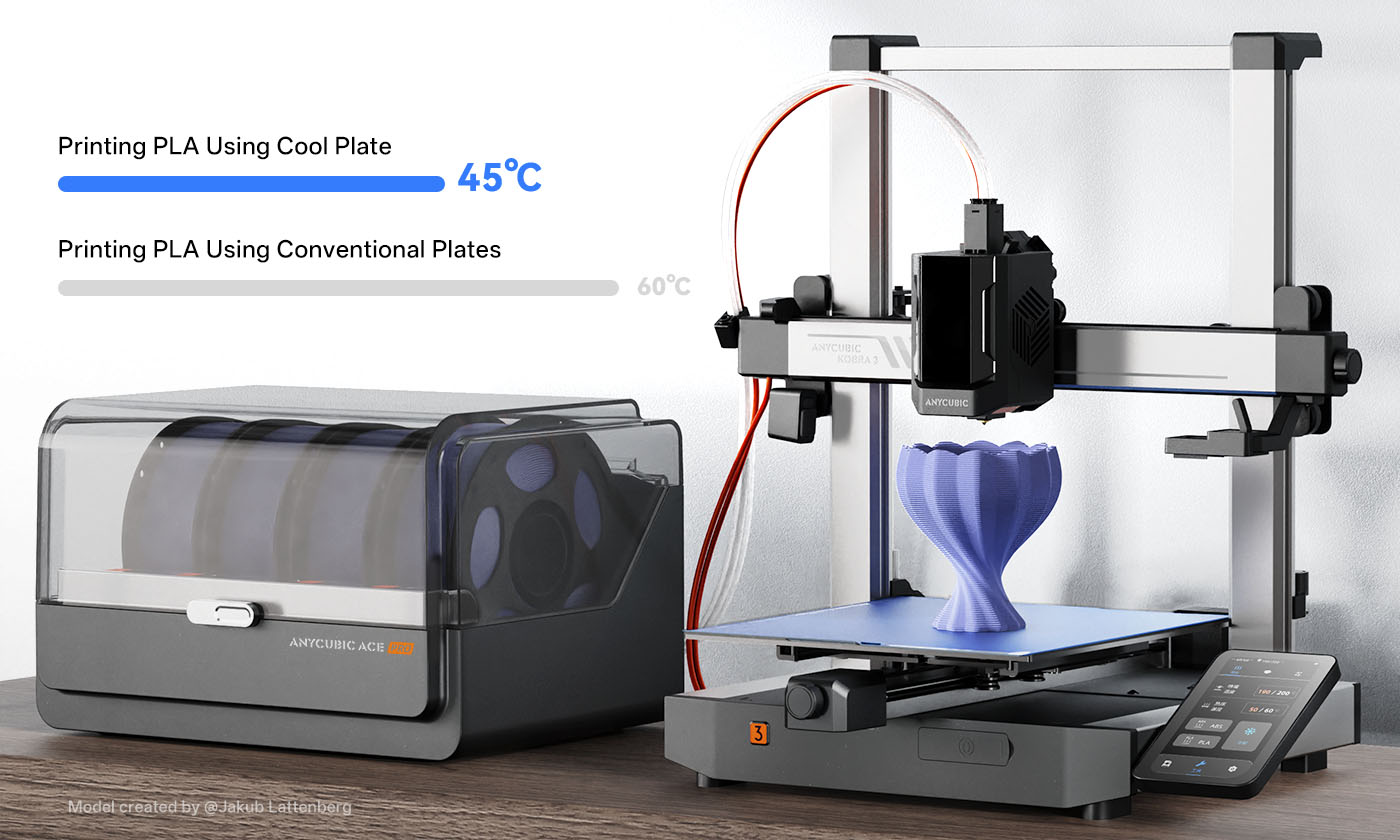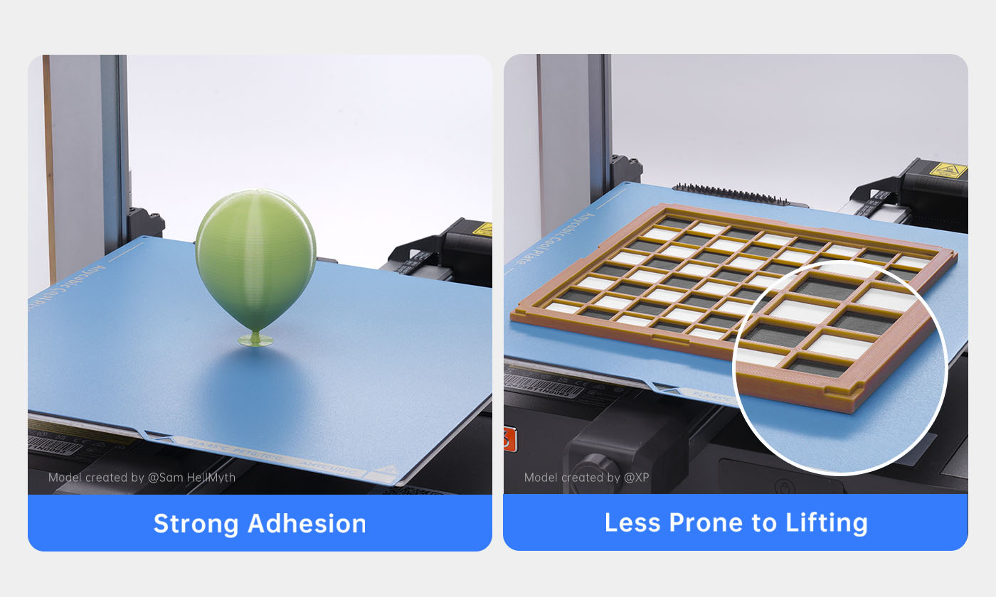 El tratamiento especial de la superficie de la placa fría ofrece a los filamentos PLA una adhesión extremadamente fuerte a solo 45 °C. Esto disminuye eficazmente la posibilidad de deformaciones y separación de la capa inferior al imprimir piezas pequeñas y modelos a gran escala.