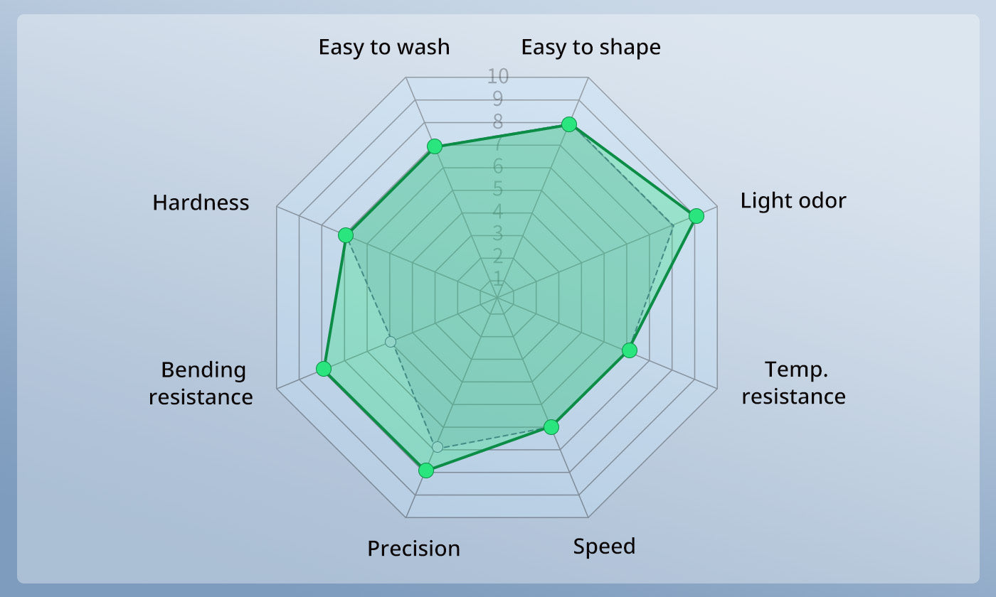 Una mejora en la resiliencia de la resina de origen vegetal aporta buena dureza y resistencia a los modelos, haciéndolos más fáciles de moldear y a prueba de golpes.