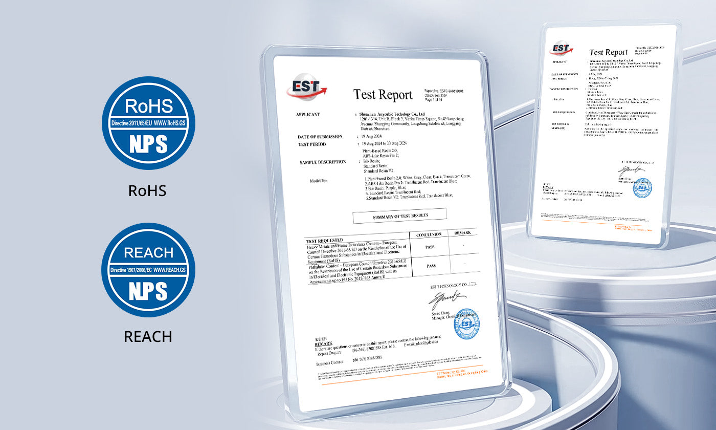 Anycubic Resina Eco 2.0 se deriva principalmente de la soja, ofreciendo una experiencia de impresión de bajo olor. Cuenta con certificaciones de conformidad con las normas RoHS y REACH, lo que garantiza mayor seguridad y tranquilidad durante su uso.