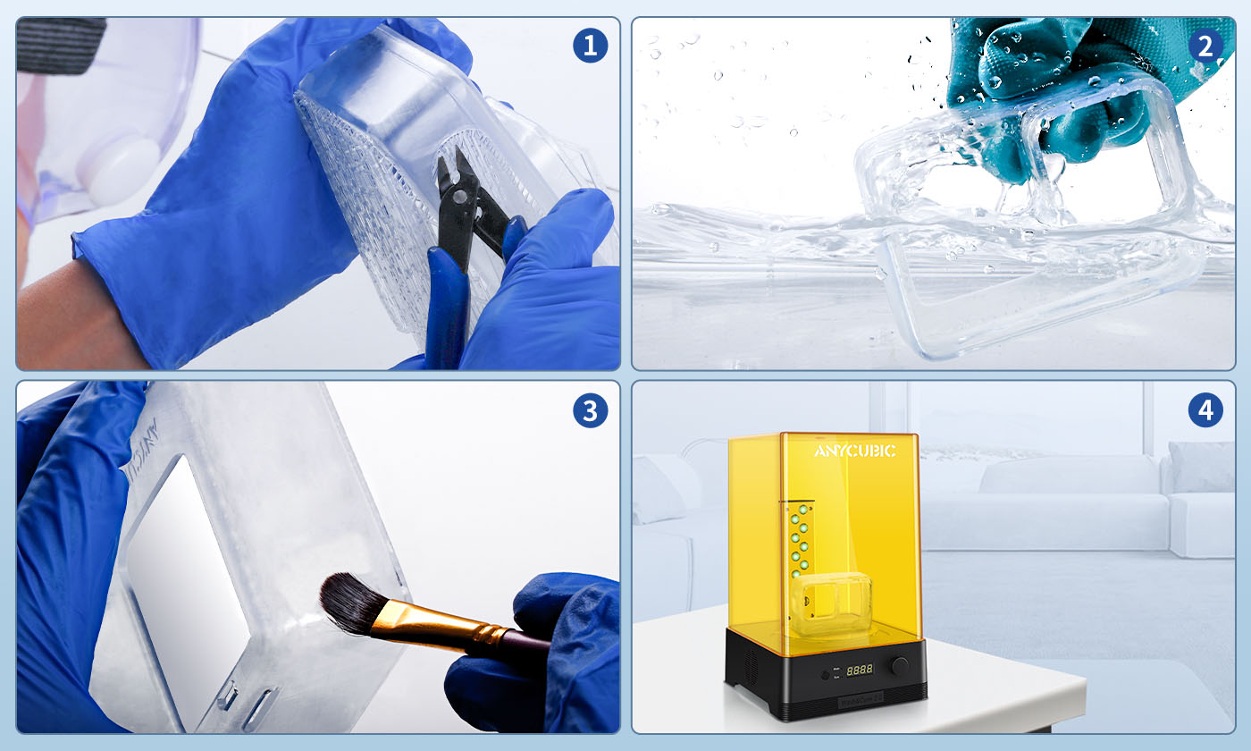 B. Sumergir el modelo en la solución de limpieza, enjuagarlo o lavarlo ultrasónicamente, y luego extraerlo y escurrirlo. Se recomiendan las máquinas de lavado y curado ANYCUBIC para garantizar un mejor resultado.